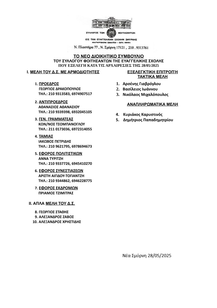 Την 28/05/2025 ημέρα Τετάρτη το απόγευμα και ώρα 18:30 μ.μ. ο Σύλλογος Φοιτησάντων στην Ευαγγελική Σχολή Σμύρνης διοργανώνει Έκτακτη Γενική Συνέλευση - Εκλογές για την ανάδειξη του νέου Δ.Σ. και Εξελεγκτικής Επιτροπής στα γραφεία του Συλλόγου επί της οδού Πλαστήρα 77 και Μέλητος 1-3. Παράκληση για τη συμμετοχή σας για να υπάρχει αυξημένη απαρτία στη λήψη αποφάσεων και να υποβληθούν όσο το δυνατόν περισσότερες υποψηφιότητες και για τα δύο καταστατικά όργανα του Συλλόγου, ώστε να υπάρχει ενισχυμένη εκπροσώπηση για το Σύλλογο. (MENU)